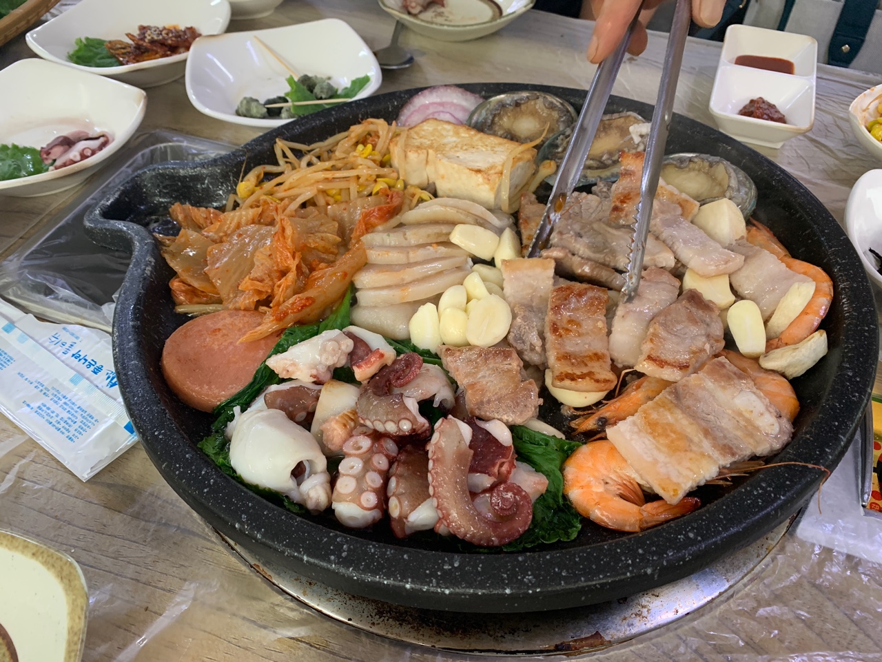 삼겹살, 버섯, 새우, 전복, 두부, 양파, 분홍소세지가 처음에 나와서 불판에 올리고, 그 다음 문어가 나온다.