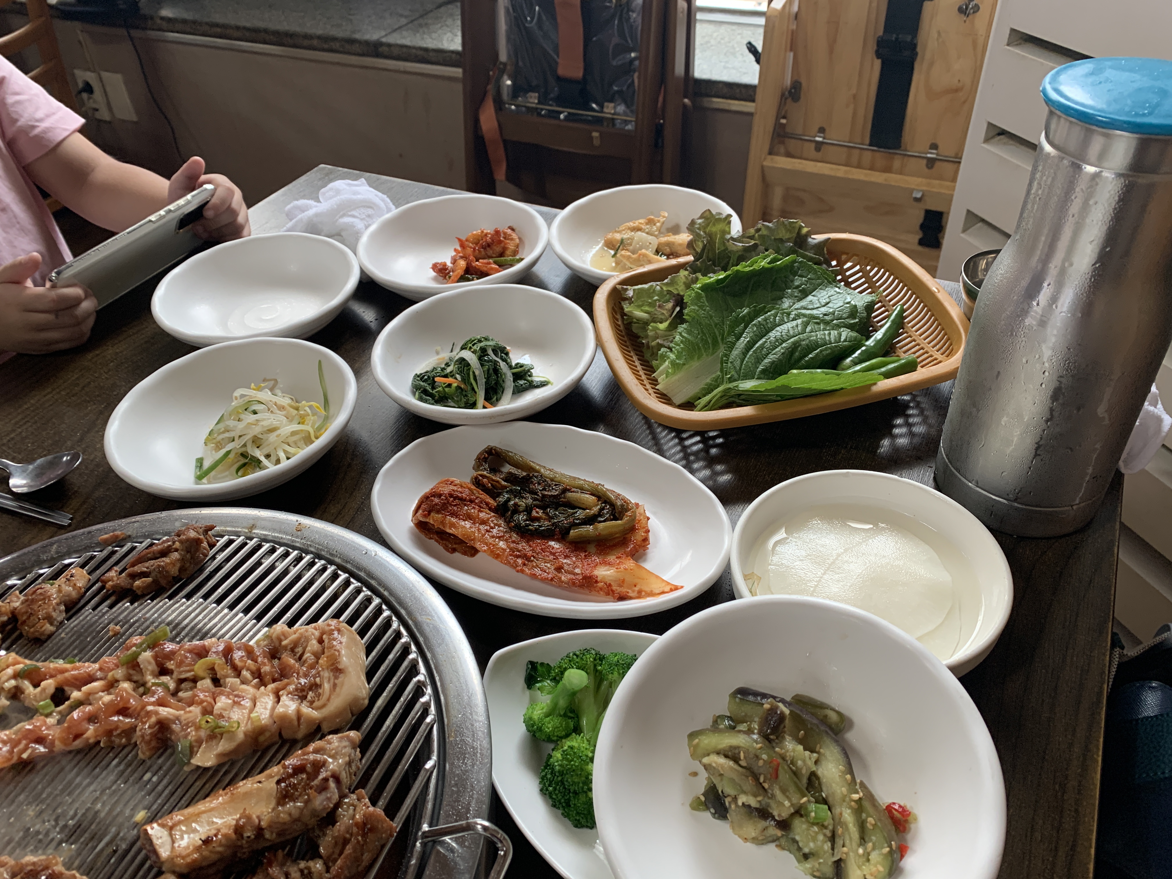주문을 하면 기본 반찬이 나오는데 보통 고기집에서 보기 어려운 반찬인 쭈꾸미, 소라, 새우 등 해산물이 나온다.