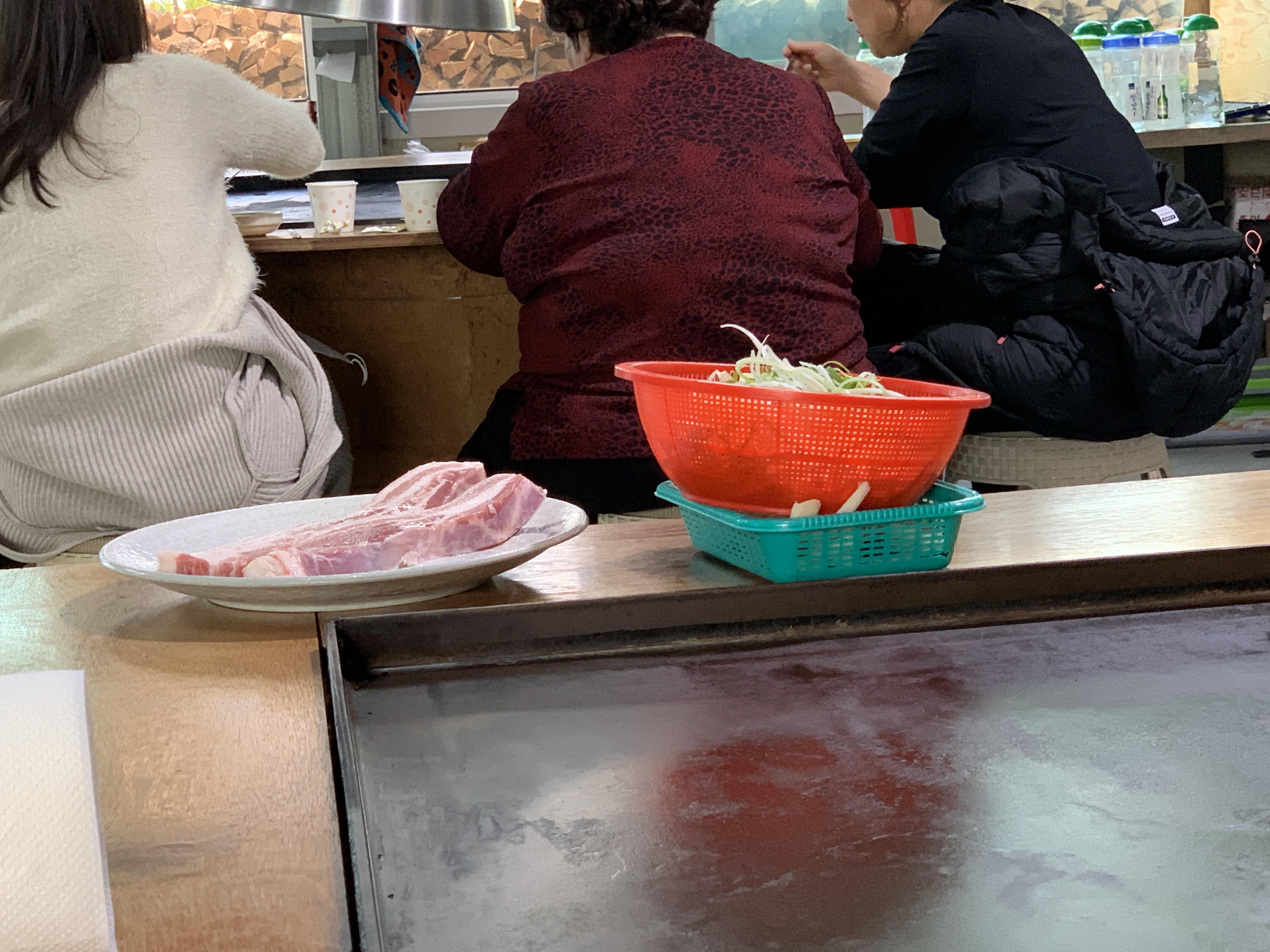 뜨거운 철판에서 구워진 삼겹살은 겉은 바삭하면서 속은 촉촉했다.