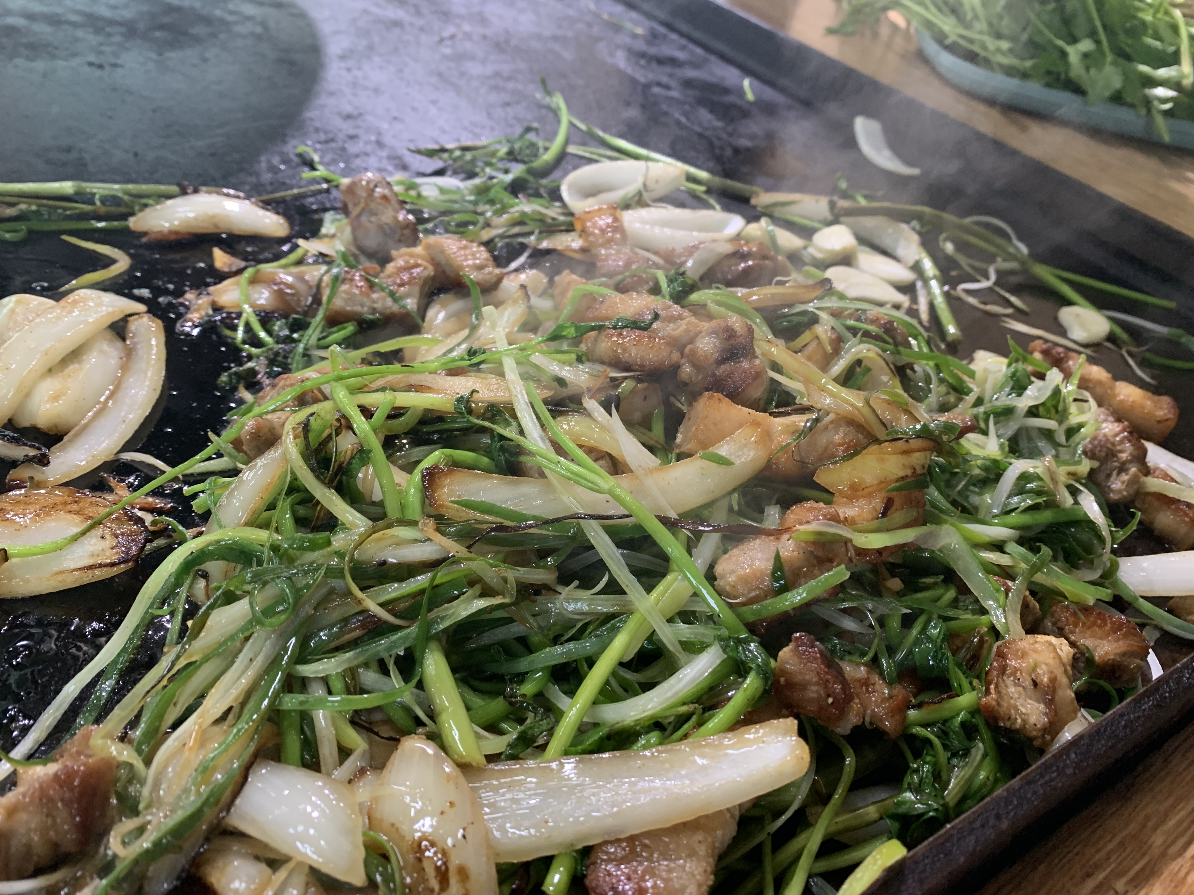 뜨거운 철판에서 구워진 삼겹살은 겉은 바삭하면서 속은 촉촉했다.