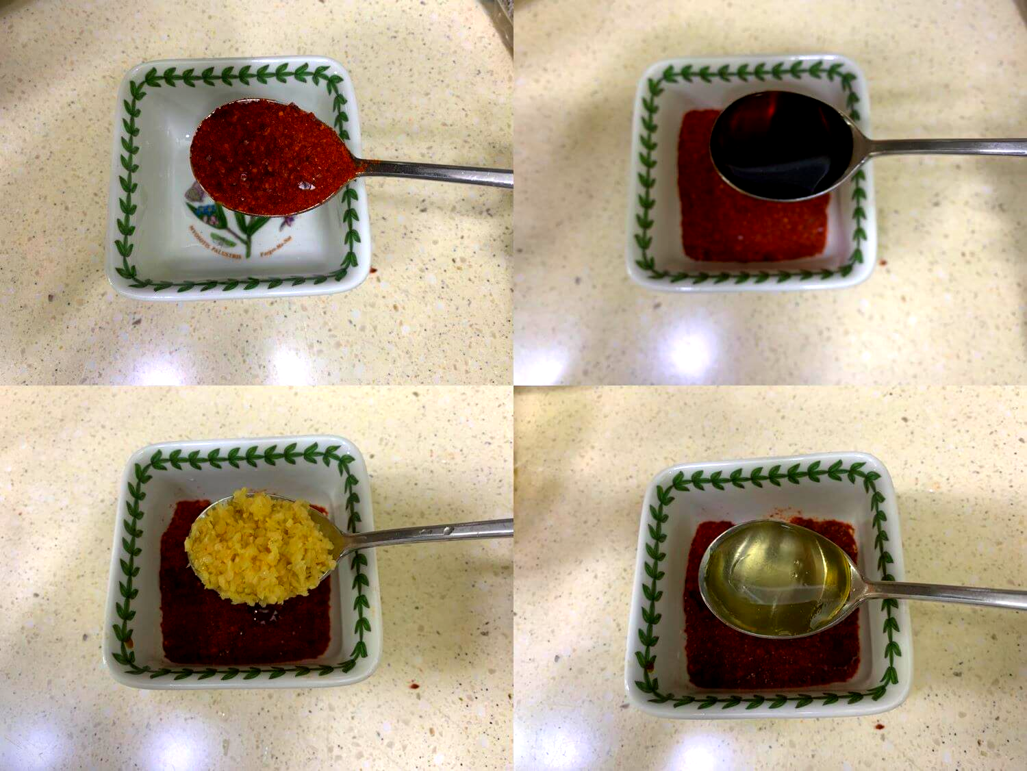 고춧가루 3큰술 / 간장 3큰술 / 맛술 2큰술 / 꿀 1큰술 / 다진 마늘 1큰술