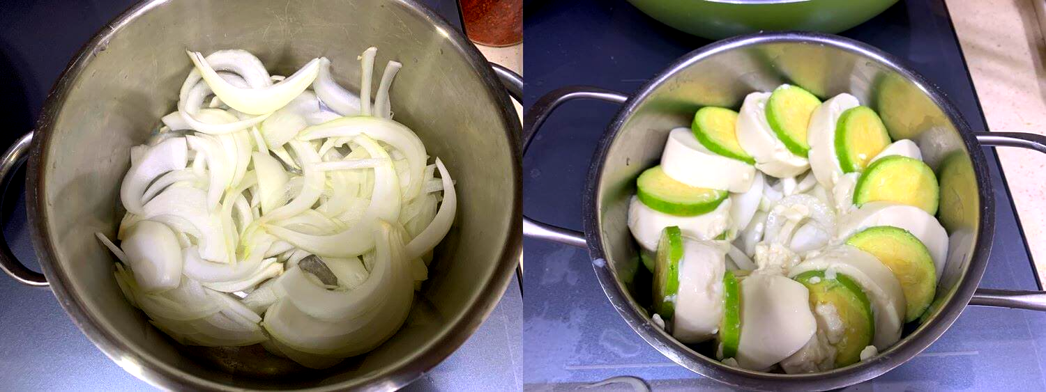 3, 양파를 깔고 애호박, 순두부 순으로 올린다.