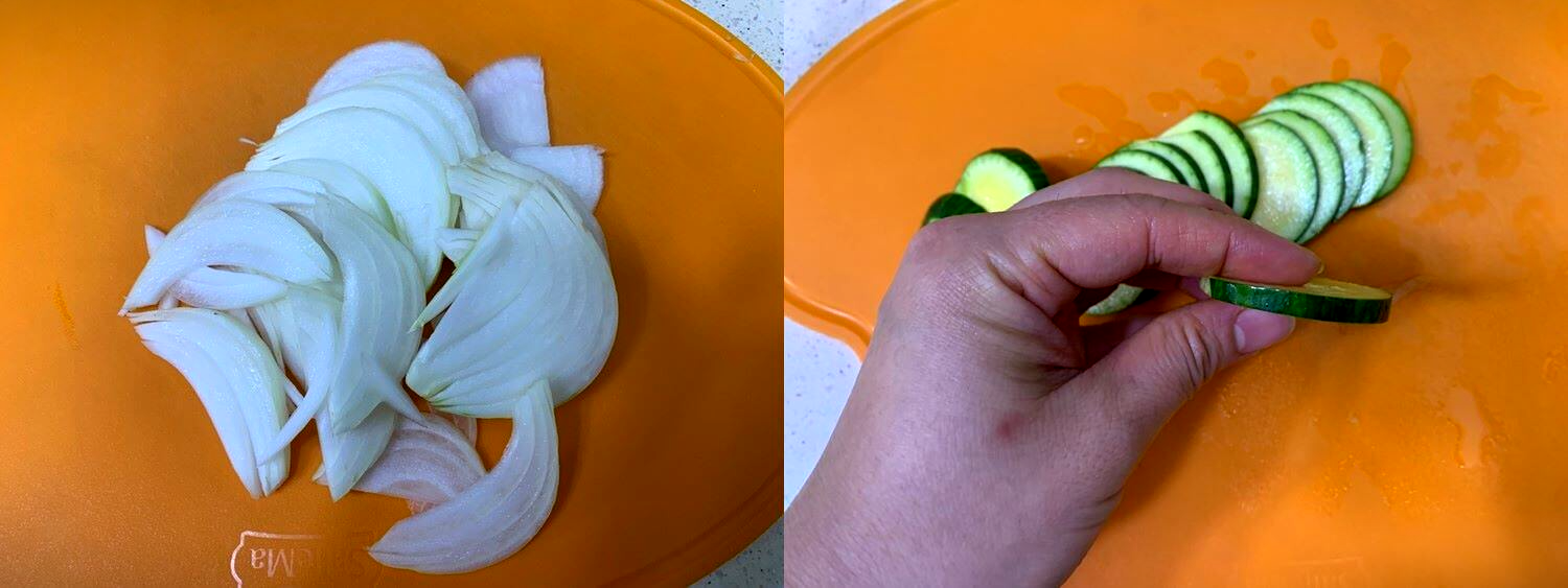 1. 양파는 채 썰고 애호박은 두껍지도 얇지도 않은 두께(애호박전할 때 두께)로 둥글게 썬다.