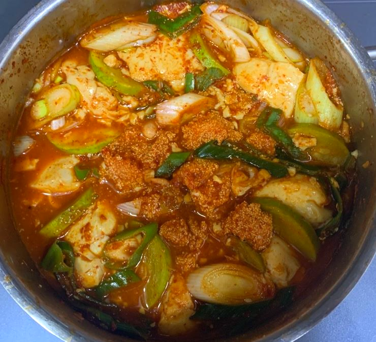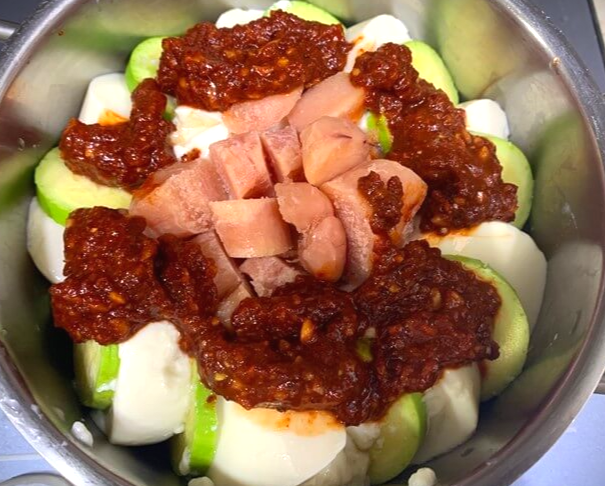 4. 명란젓과 양념장을 올리고 물 200ml를 넣고 중 약불로 끓인다.