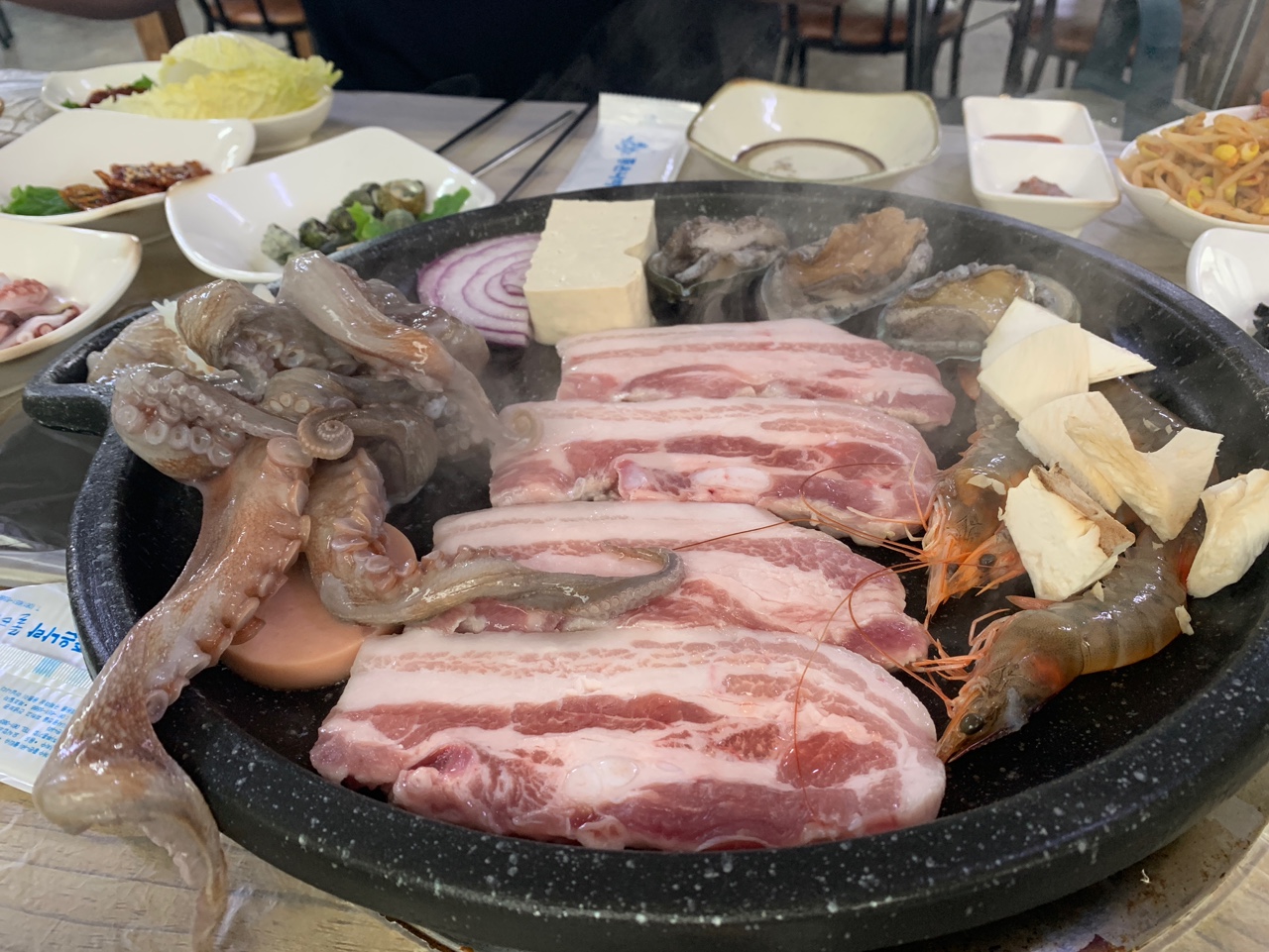 삼겹살, 버섯, 새우, 전복, 두부, 양파, 분홍소세지가 처음에 나와서 불판에 올리고, 그 다음 문어가 나온다.