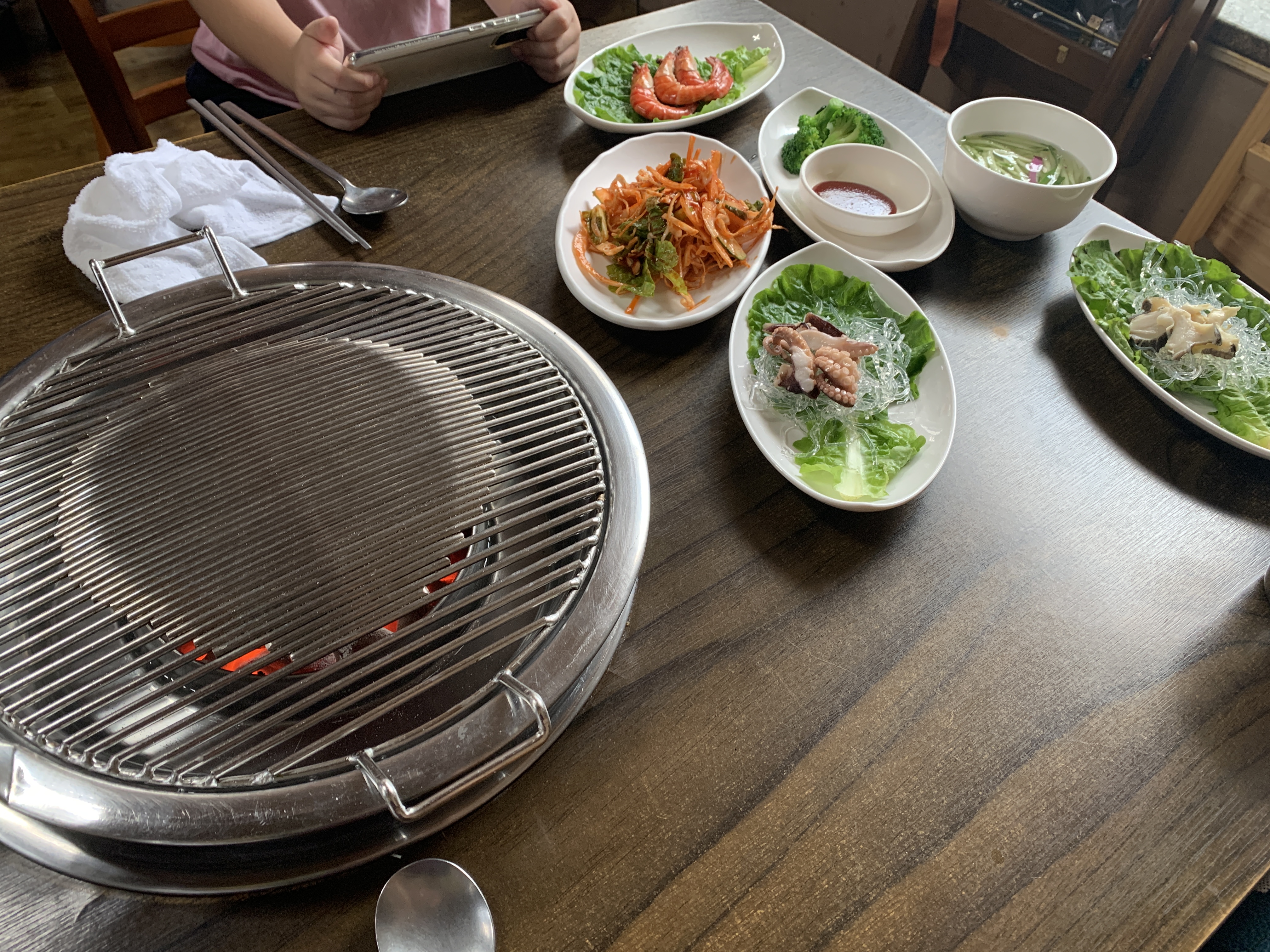 주문을 하면 기본 반찬이 나오는데 보통 고기집에서 보기 어려운 반찬인 쭈꾸미, 소라, 새우 등 해산물이 나온다.
