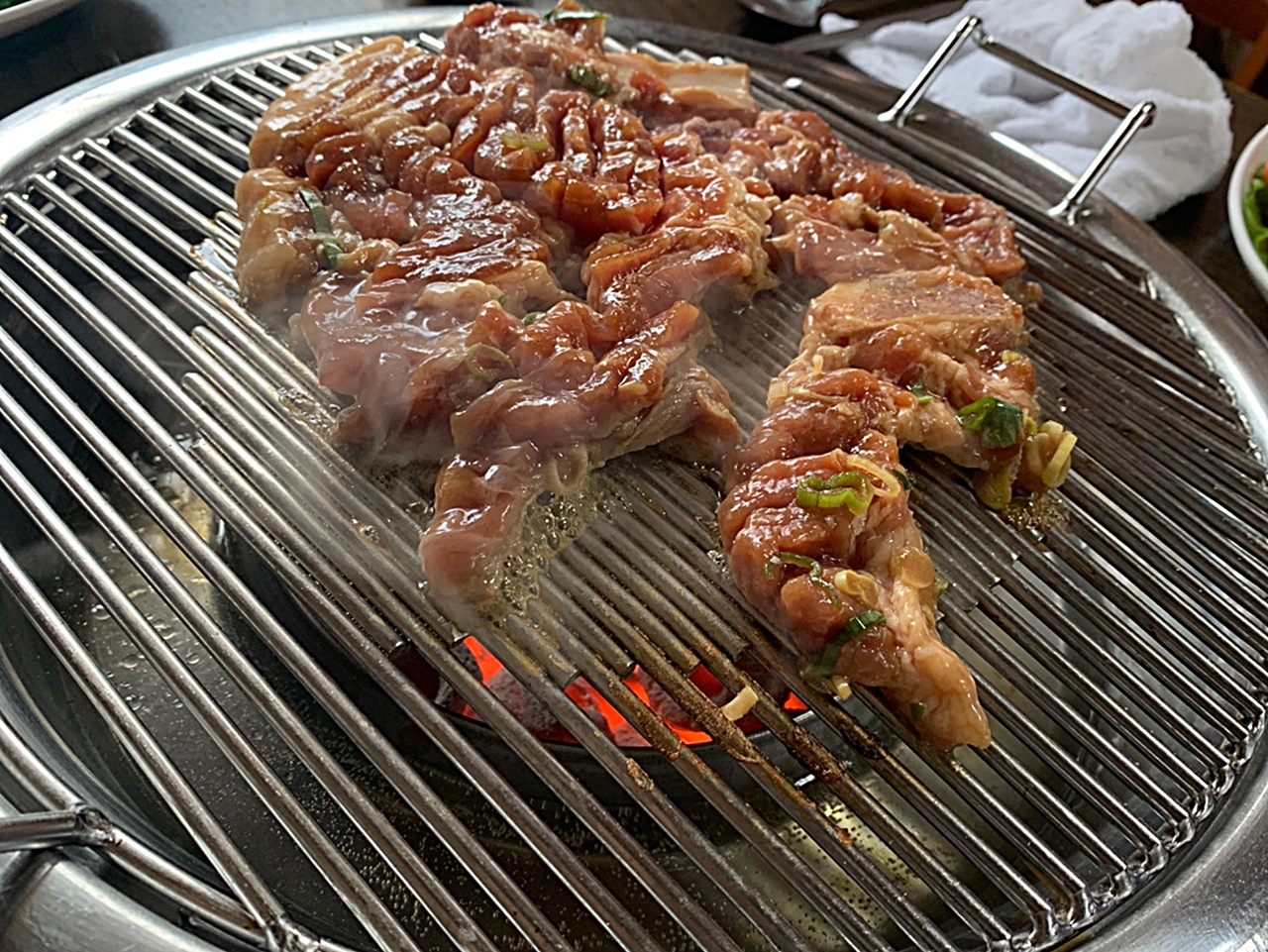 돼지갈비는 숯불위 불판에 올려서 굽는데 불판 가득 올려서 굽으면 덜 탄다고 한다.