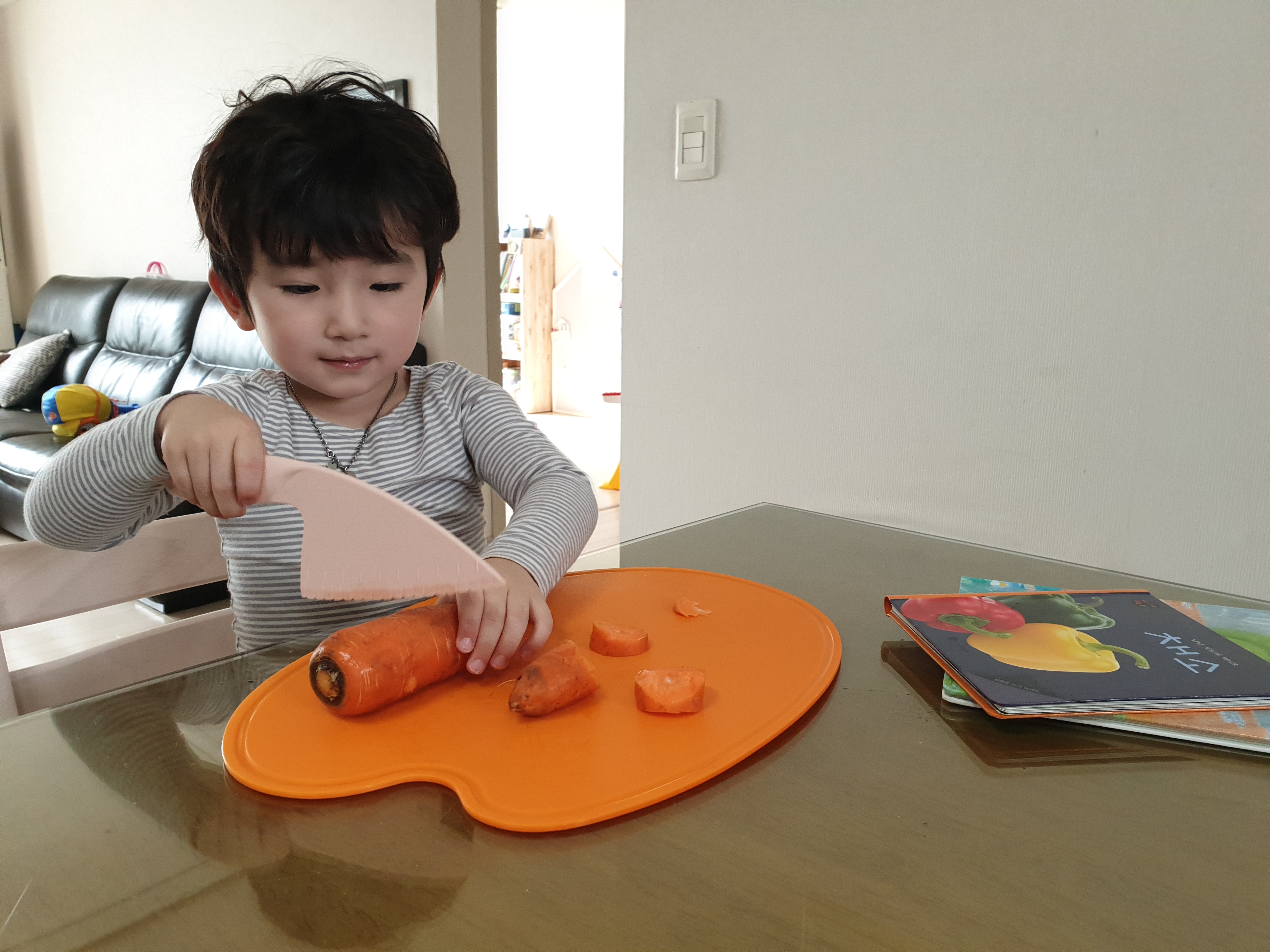 유아용 칼이라서 그런지 잘 안 잘려서 무난이가 두손으로 눌러야 겨우 잘렸다.