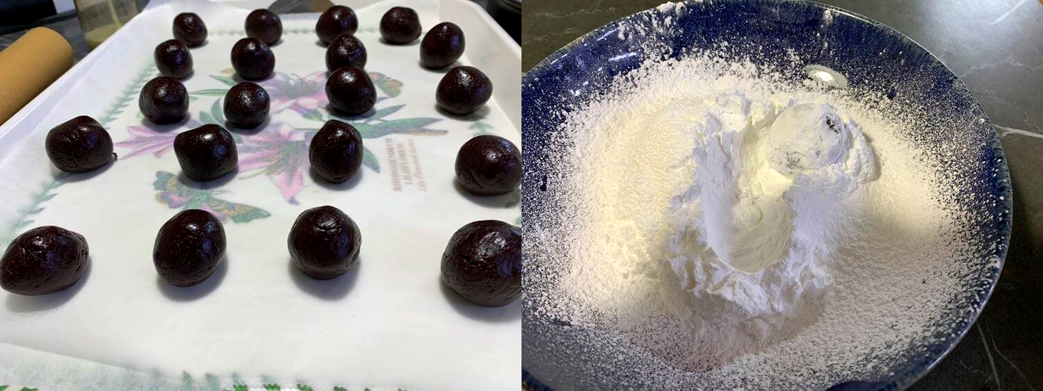 5. 휴지 한 반죽을 원하는 양만큼 분할해서 동그랗게 만든 후 슈가파우더에 굴려준다.